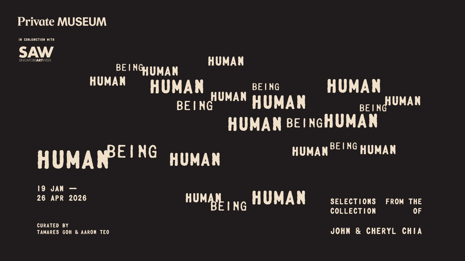 In conjunction with Singapore Art Week 2026, The Private Museum is pleased to present Human Being Human: Selections from the Collection of John and Cheryl Chia. Kickstarting The Private Museum’s 2026 programming, this exhibition invites contemplation on the human experience. Shaped over more than two decades, the private collection of John and Cheryl Chia underpins this showcase, inspiring audiences to explore how art can illuminate the complexities of contemporary existence.
