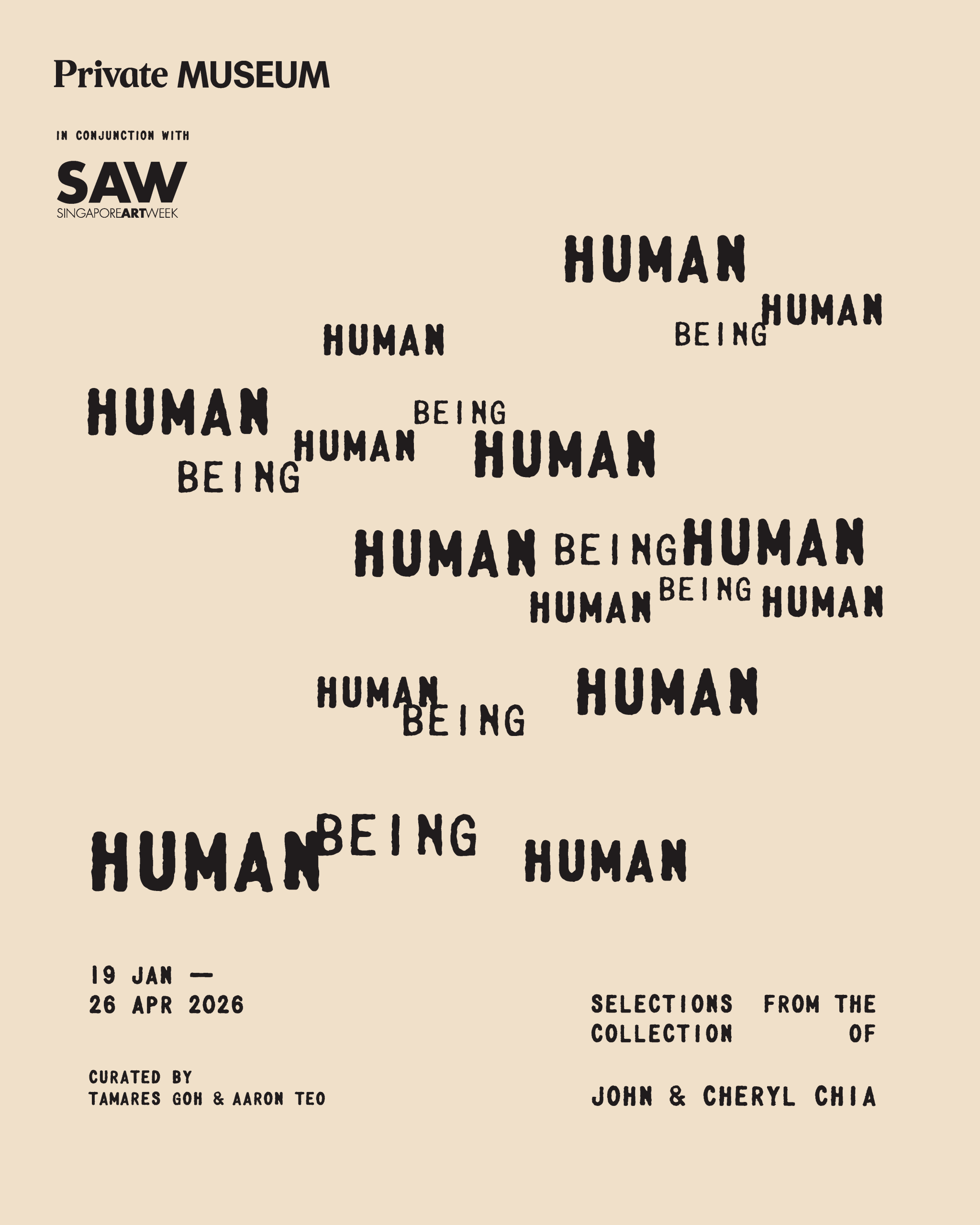 In conjunction with Singapore Art Week 2026, The Private Museum is pleased to present Human Being Human: Selections from the Collection of John and Cheryl Chia. Kickstarting The Private Museum’s 2026 programming, this exhibition invites contemplation on the human experience.