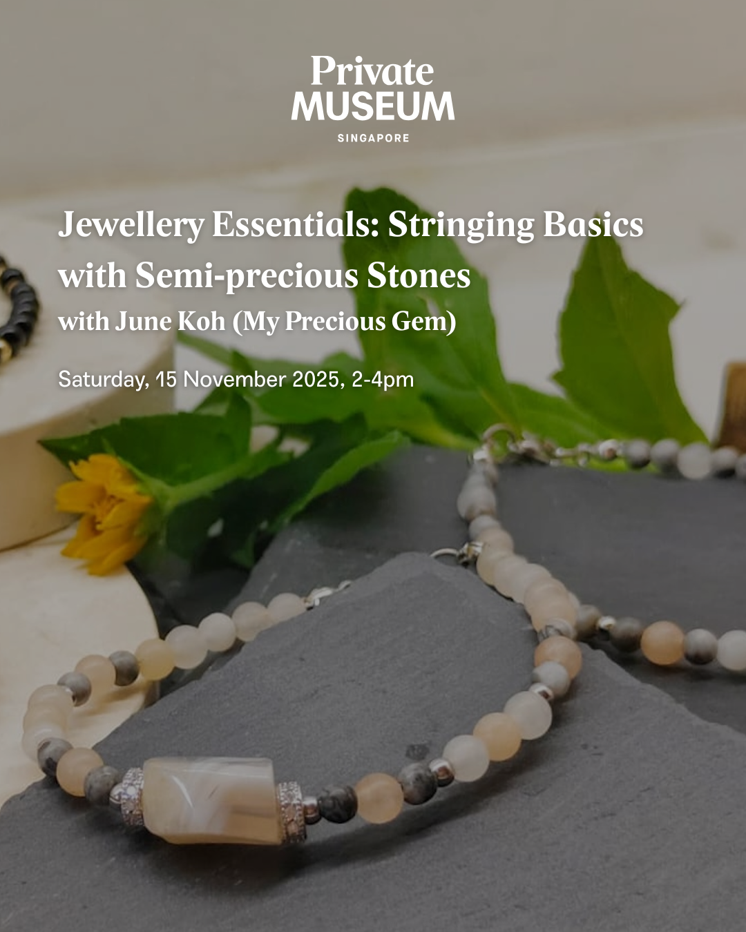 Participants will be introduced to fundamental jewellery stringing techniques before designing a unique bracelet using semi-precious stones such as Agate, Aventurine, and Jasper. Each piece will be finished with a choice of gold, silver-plated, or stainless steel findings. The session will conclude with a guided tour of The Private Museum’s current exhibition.