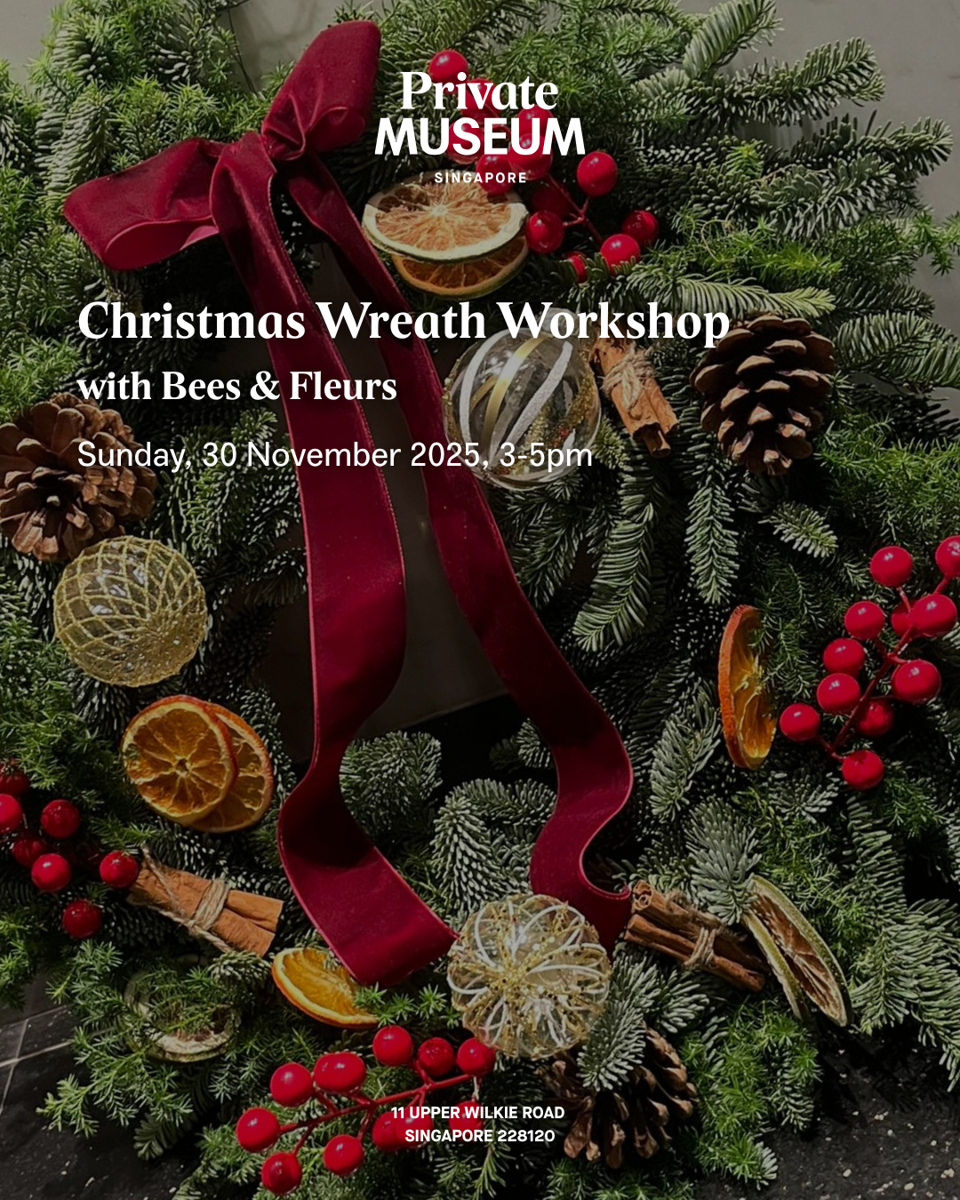 Get into the holiday spirit by crafting your very own stunning Christmas wreath! As part of our year-end outreach programme lineup, The Private Museum is delighted to once again present a Christmas wreath workshop with Bees & Fleurs. In this hands-on session, participants will be guided through the process of creating a beautiful wreath using fresh greenery, seasonal decorations, and personalised touches. By the end of the workshop, every Adult participant will bring home their very own wreath. Each adult who registered for the workshop may bring one child (aged 10 years old & below), and Adult-Child pairs will work together on a single wreath.